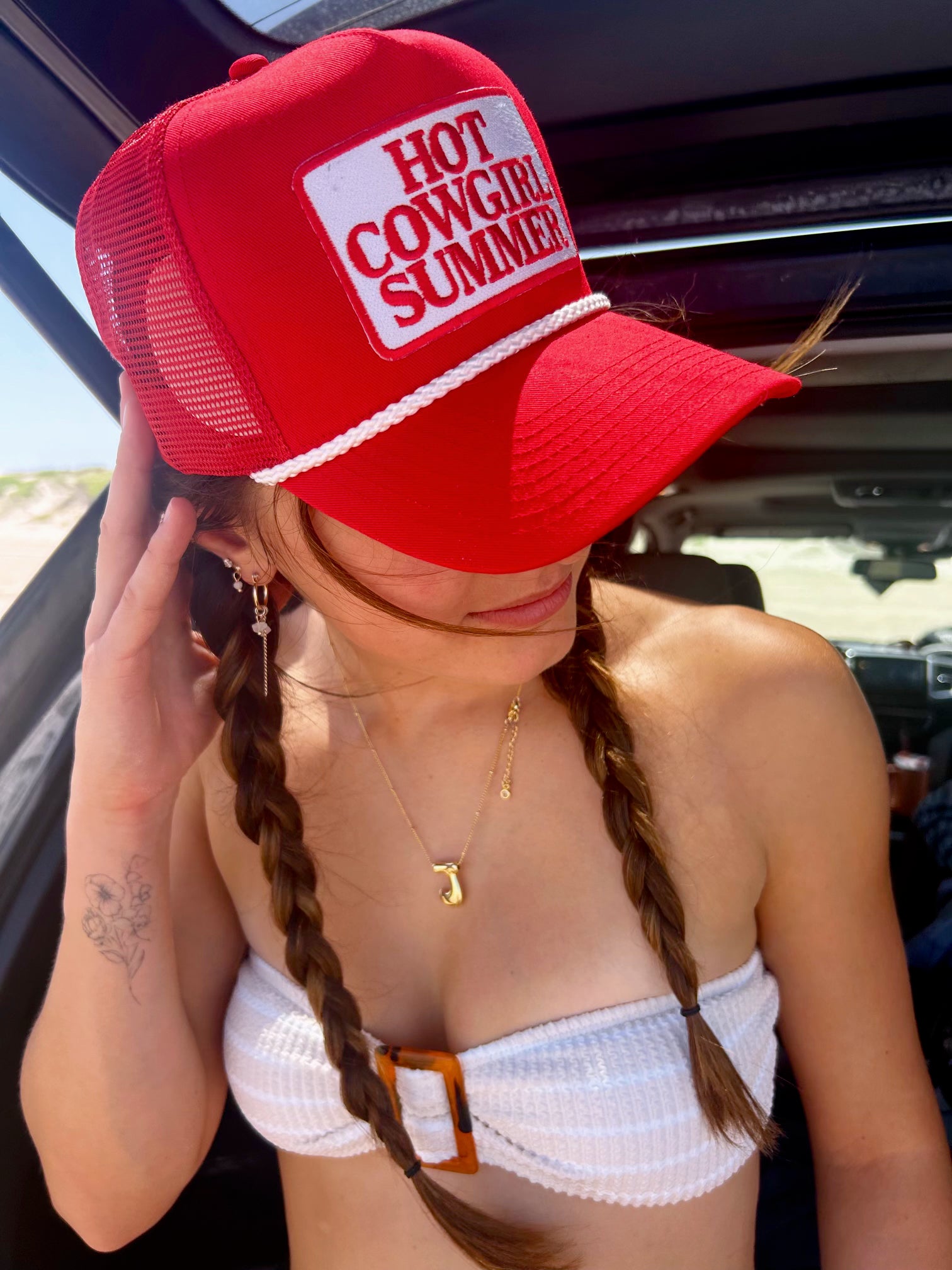 Rock the "Hot Cowgirl Summer" vibe with our mesh back red trucker hat. This hat is your go-to for sunny tanning days and wild summer nights. The breathable mesh keeps you cool while still having coverage. Grab your perfect summer cap now!🤠❤️